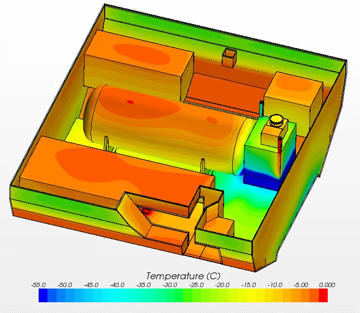 The hypothetical leak partly filled up the connexion space with LNG at -162°C, significantly cooling the tank holding room. The goal of the analysis was to find the resulting temperature distribution in the steel structure of the tank holding room so that the effect on material strength could be assessed.