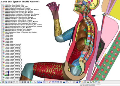 Creaform Engineering employed explicit numerical simulation using LS-Dyna software to reproduce the dynamics of pilot ejection with a Martin-Baker seat on board a Hawker Hunter fighter. In addition, the numerical simulation experts used a simplified anthropomorphic test device (ATD) model with specific kinematics and kinetics outputs to establish the risk of injury and a biofidelic numerical dummy (THUMS 50th male model) to see the effect of ejection dynamics on physiological structures. This way, the team could monitor the acceleration and forces transmitted from the seat to the pelvis and spine. The engineers also carried out a complete scan of the seat and the foam cushions and used the 3D scan data to carefully position the numerical models.