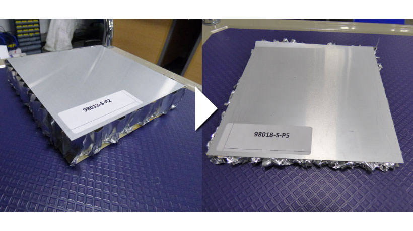 Undeformed (before the test) compared with deformed (after the test) aluminum crushable pad used in the new seat design